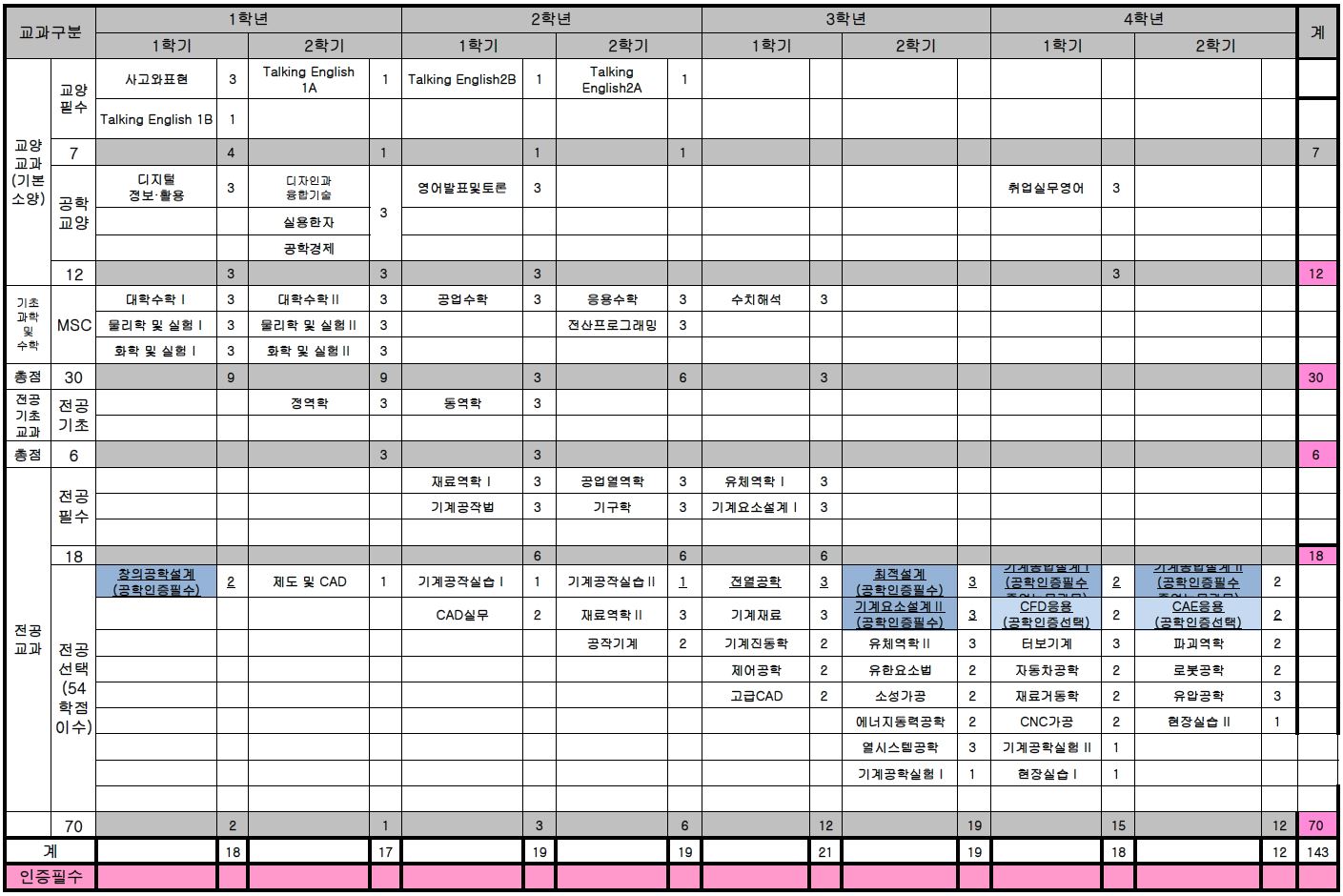 | 교양필수 | 공학교양 | 계 | 기초과학및 수학(MSC) | 계 | 전공기초 | 전공필수 | 전공선택 | 계 | |||