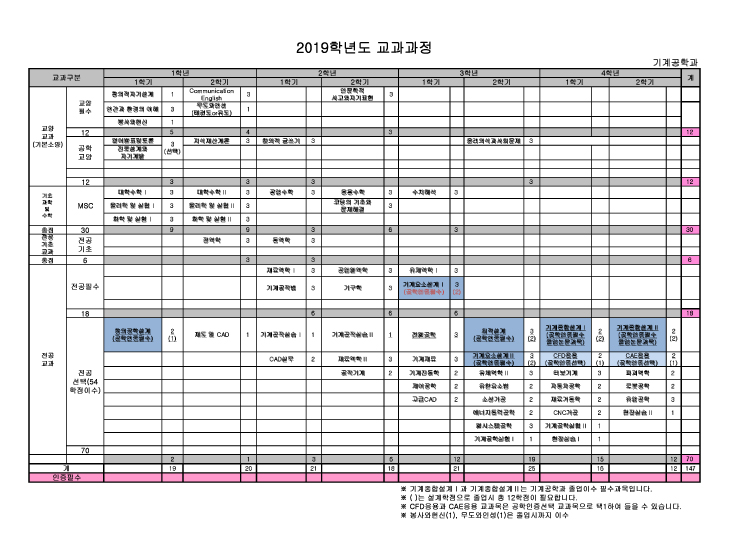 | 기계공학과 | 12 | 12 | 24 | 30 | 30 | 6 | 18 (18) | 54(52) | 78 | 8 | 140 |