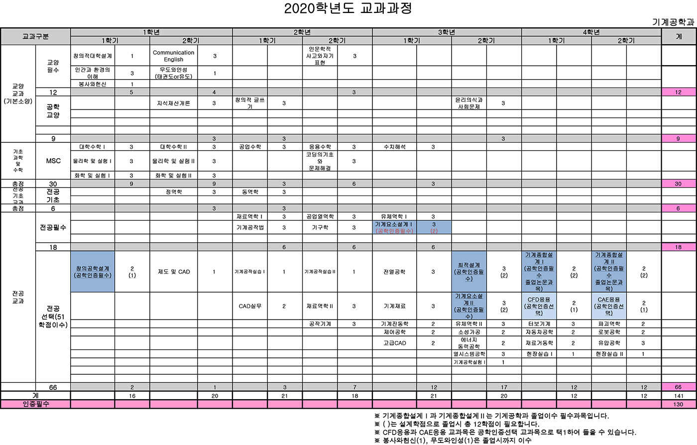 | 교양필수 | 공학교양 | 계 | 기초과학및 수학(MSC) | 계 | 전공기초 | 전공필수 | 전공선택 | 계 | |||